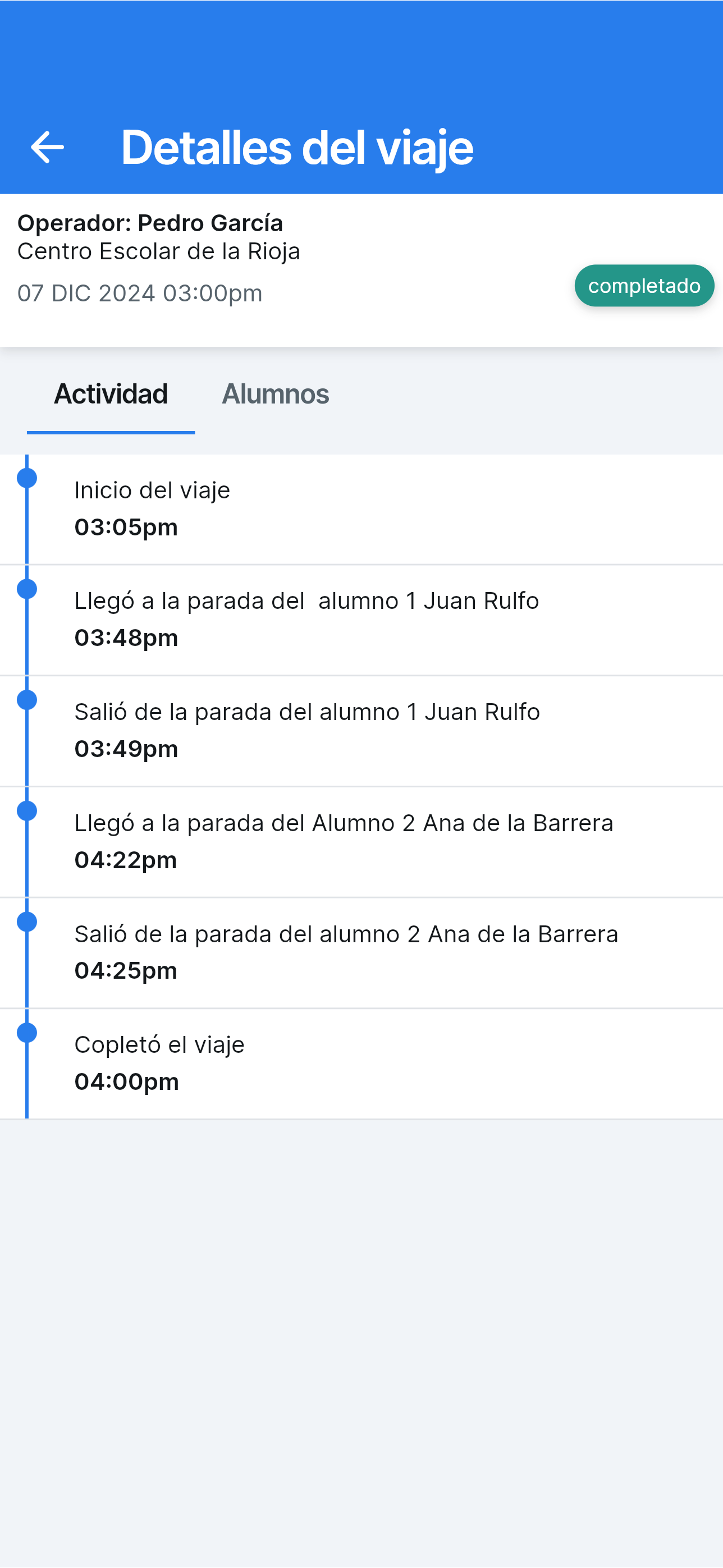 En el caso de estudiantes usando transporte público otorgado por la ciudad o municipalidad, etc., ellos indican vía el App MiBUS ,cuando se suben y bajan del camión. Adicionalmente, los padres de familia también indican cuando dejan a sus hijos/hijas en la parada indicada y pueden seguir la ruta de sus hijos/hijas.