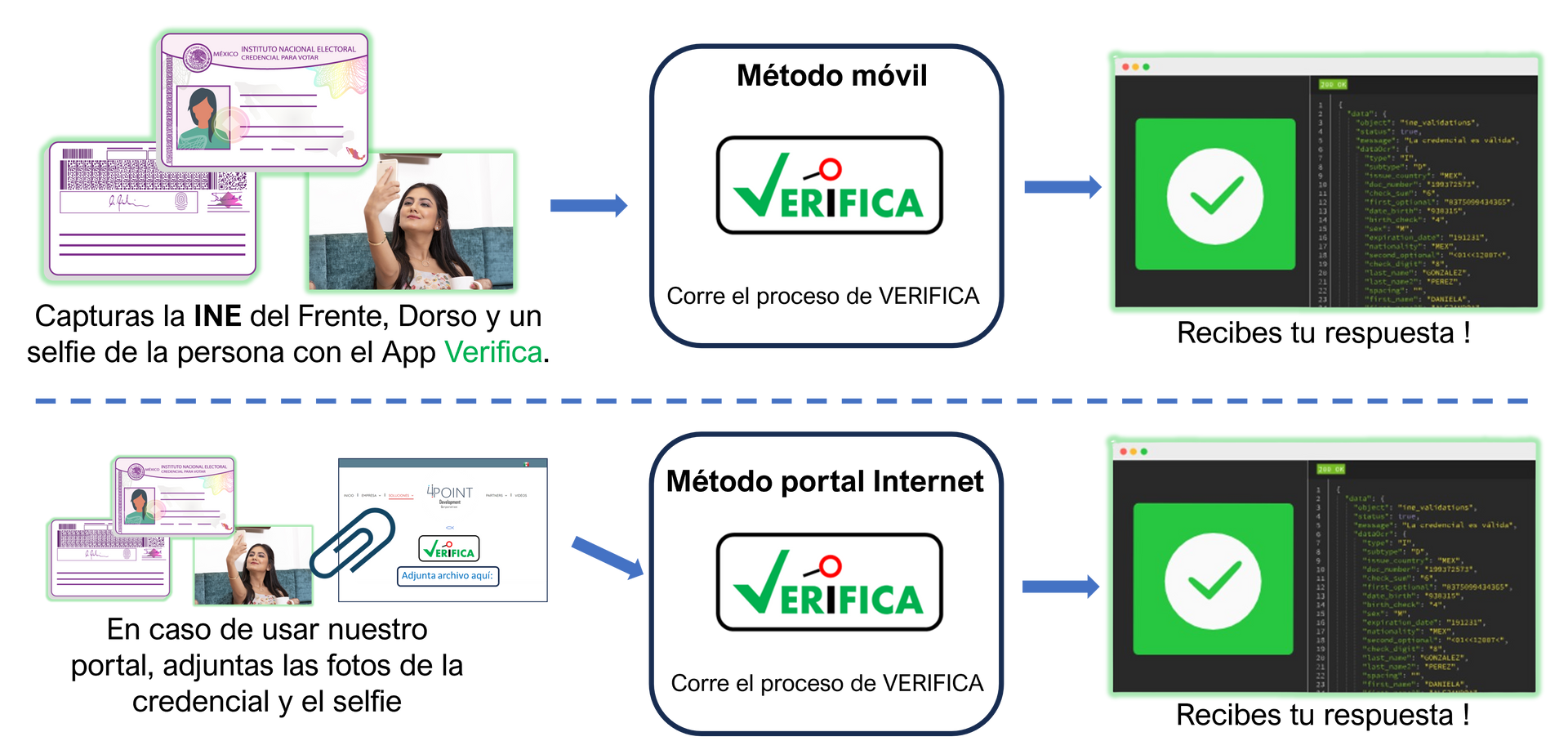 La solución vía nuestro link HTTPS, te permite enviarnos las imágenes de la credencial, la foto del supuesto dueño de la credencial, y mediante los procesos de verificación establecidos, lograr la más efectiva verificación posible logrando así tener la tranquilidad de que la credencial es válida. Adicionalmente, ambos procesos te entregan los resultados/datos de la consulta solicitada.