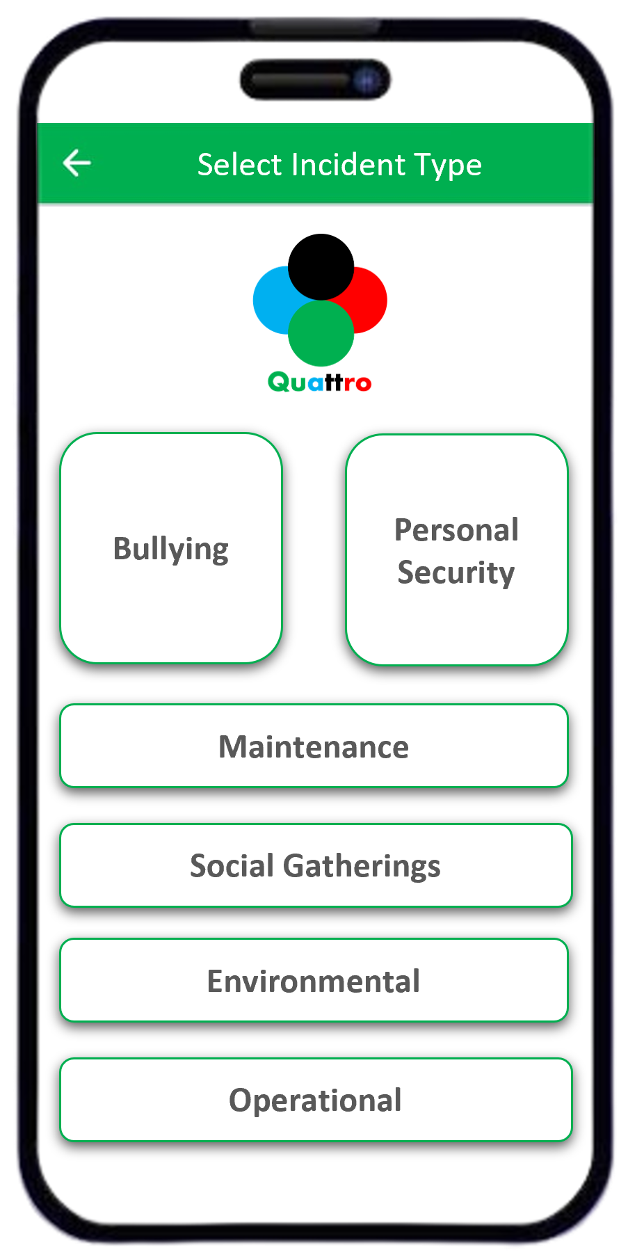 Quattro comes from the 4 cardinal points, North, South, East and West, representing the ability to report incidents from anywhere. We are not just an App but an integral solution for reporting in real-time and anonymously or not, various types of incidents such as; maintenance problems and personal situations within school grounds, office or around your city or town.